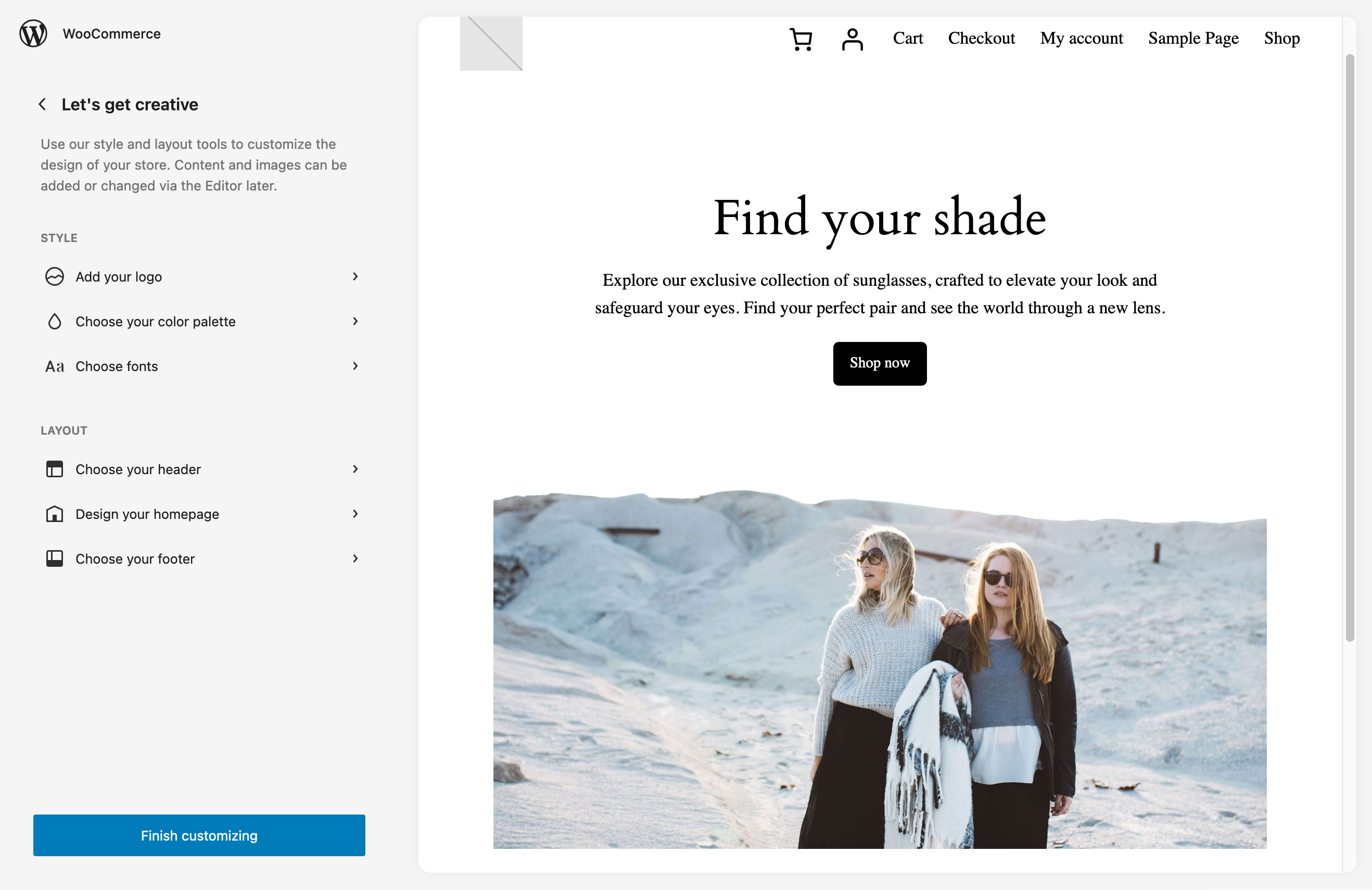 You can for example choose one of the suggested WordPress themes, or you can rely on the integrated store designer offered by WooCommerce:
