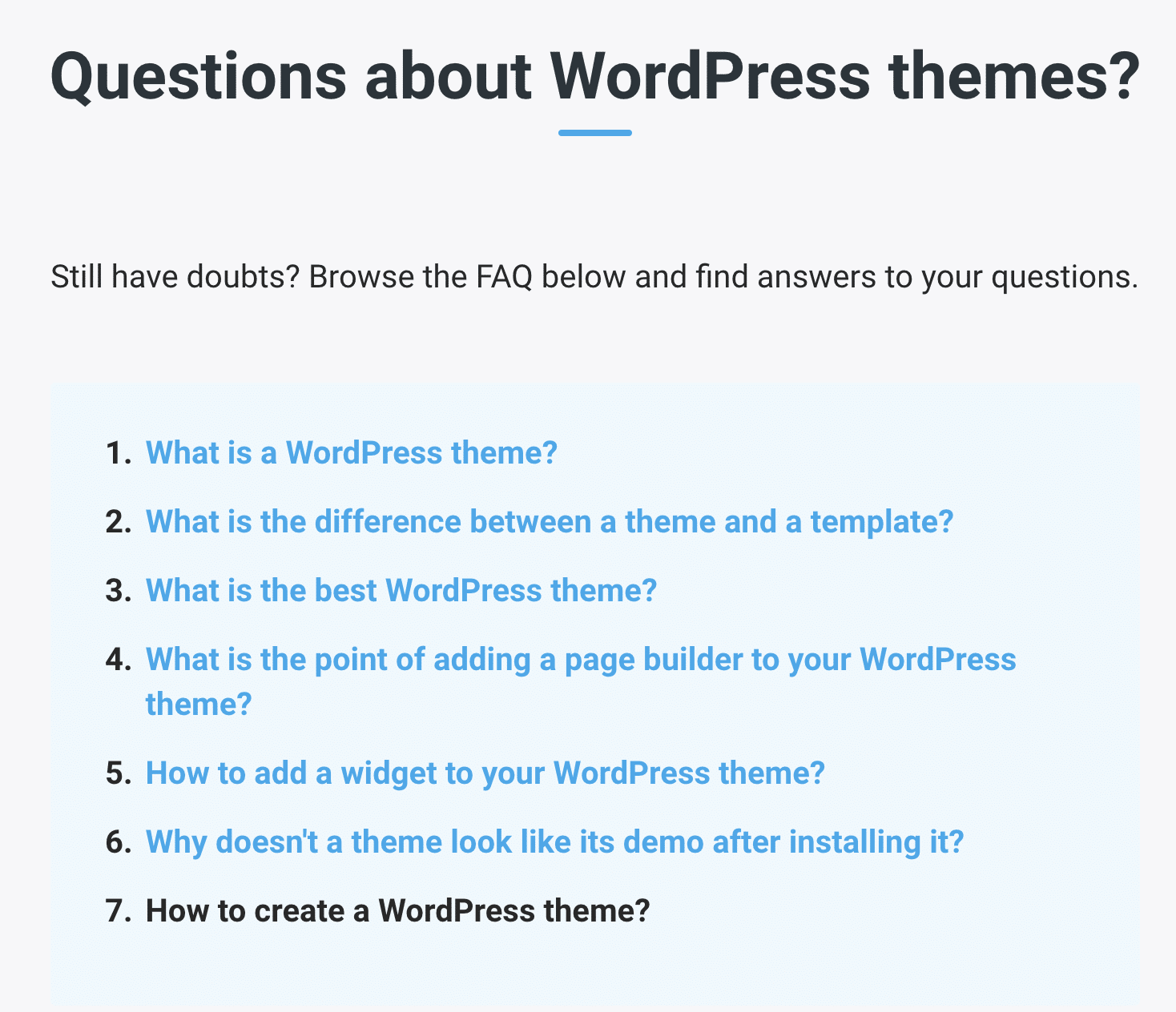 - In terms of customization, you will only be able to do the bare minimum. Your FAQ will be efficient and functional but it will have a basic appearance: you can’t add icons to highlight the different questions, add small effects, etc. It’s incidental but it can count if you’re looking for a more advanced look.