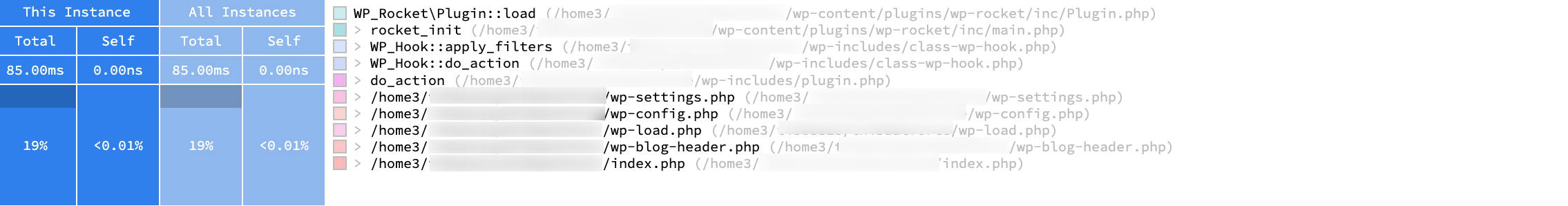 - une présentation des fichiers, fonctions PHP et plugins WordPress les plus lents, avec leur chemin d’accès (répertoire) et leur temps de réponse.